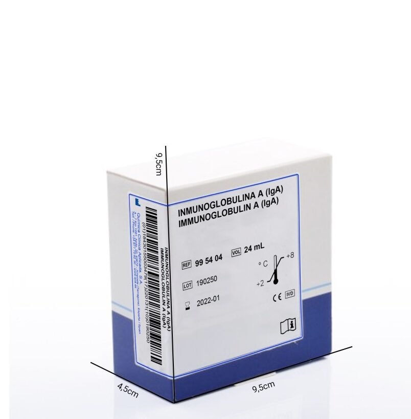 The reagent allows quantifying the level of human IgA present in the sample by comparing the turbidimetric response produced with that obtained from the standard curve of known human IgA concentrations. The reagent is an antiserum anti-human IgA which reacts with the IgA of the serum giving protein aggregates. This aggregation process produces an increase in the Abs. of the system.